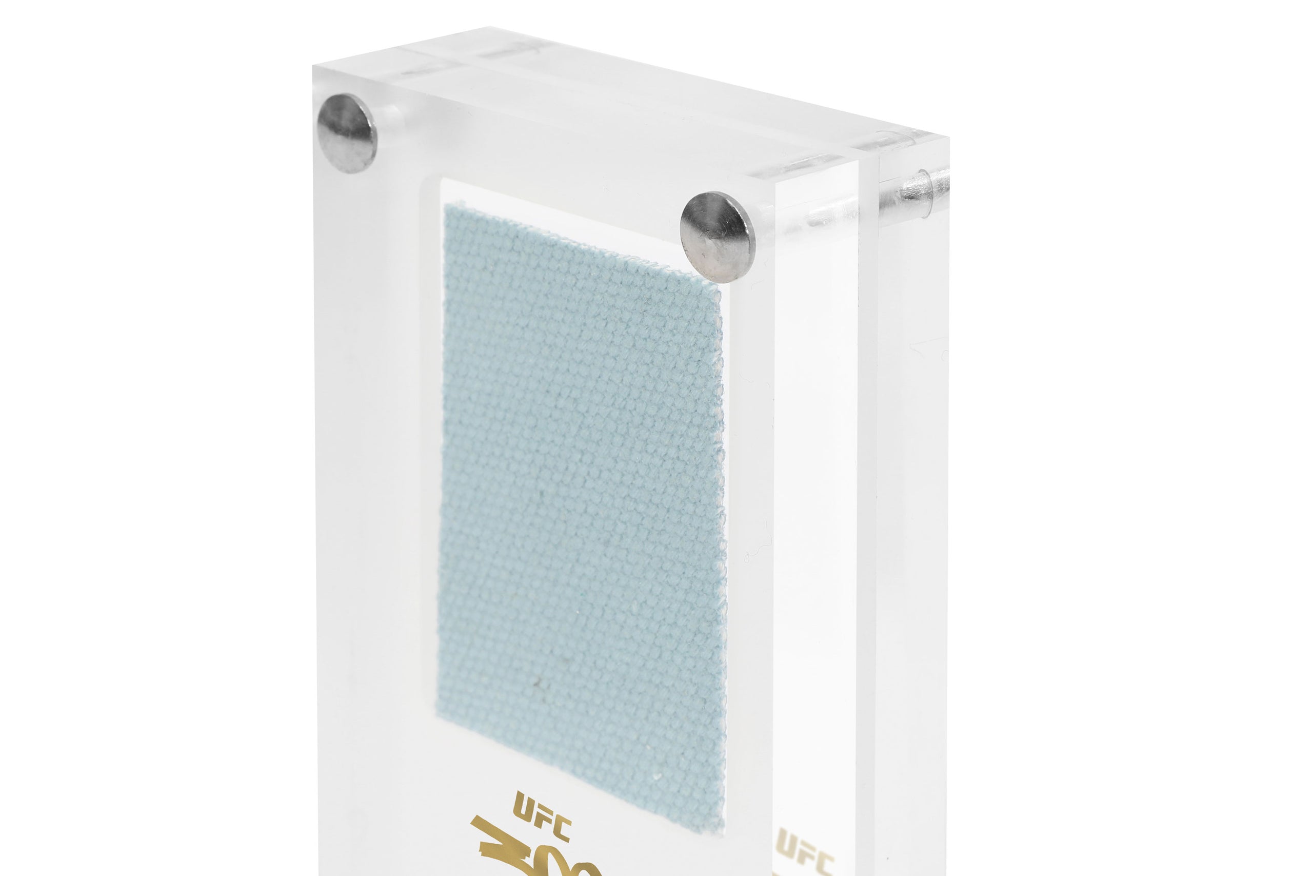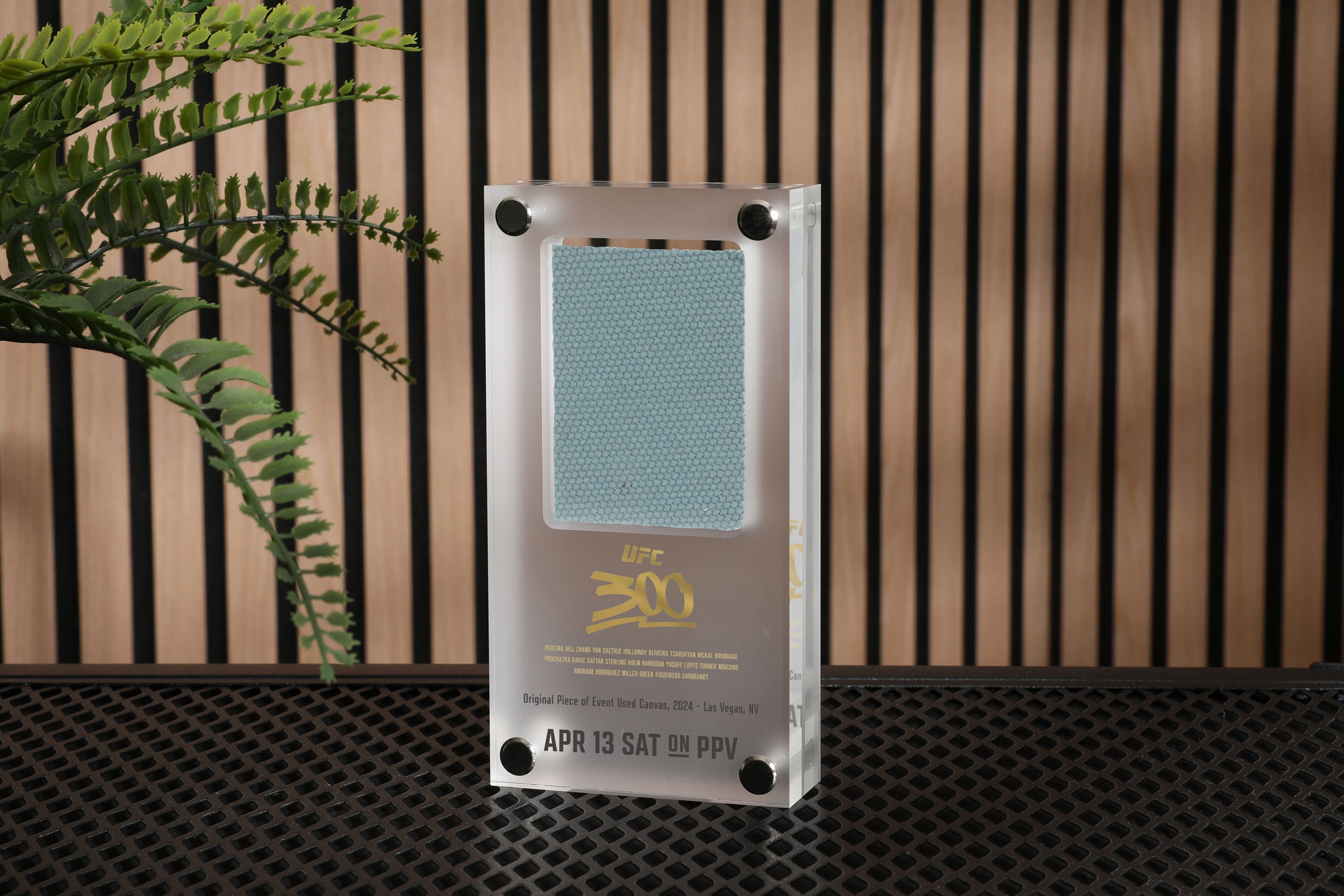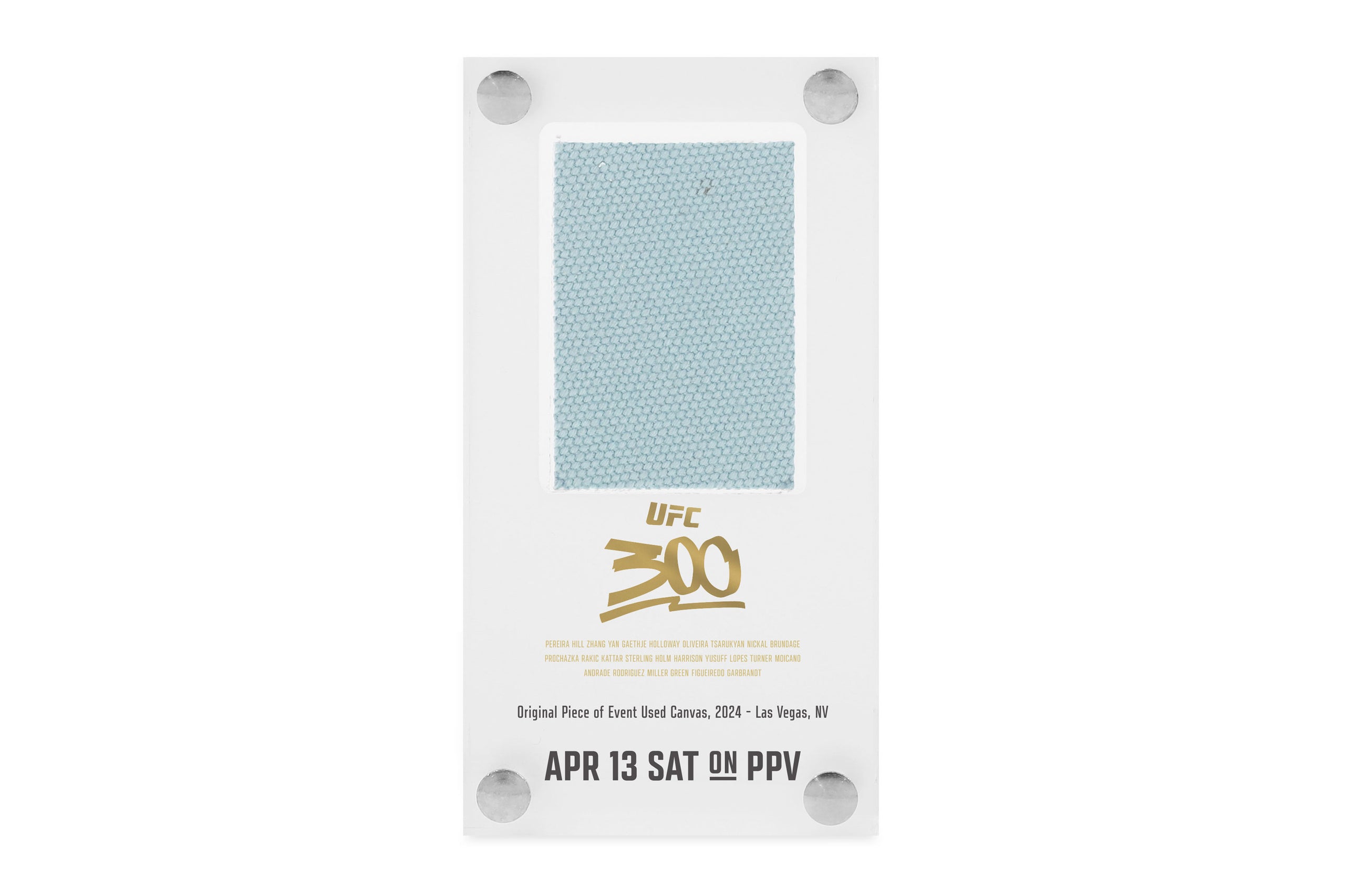 The canvas is crooked in the glass and the gold writing that says the fighters on the card is unreadable