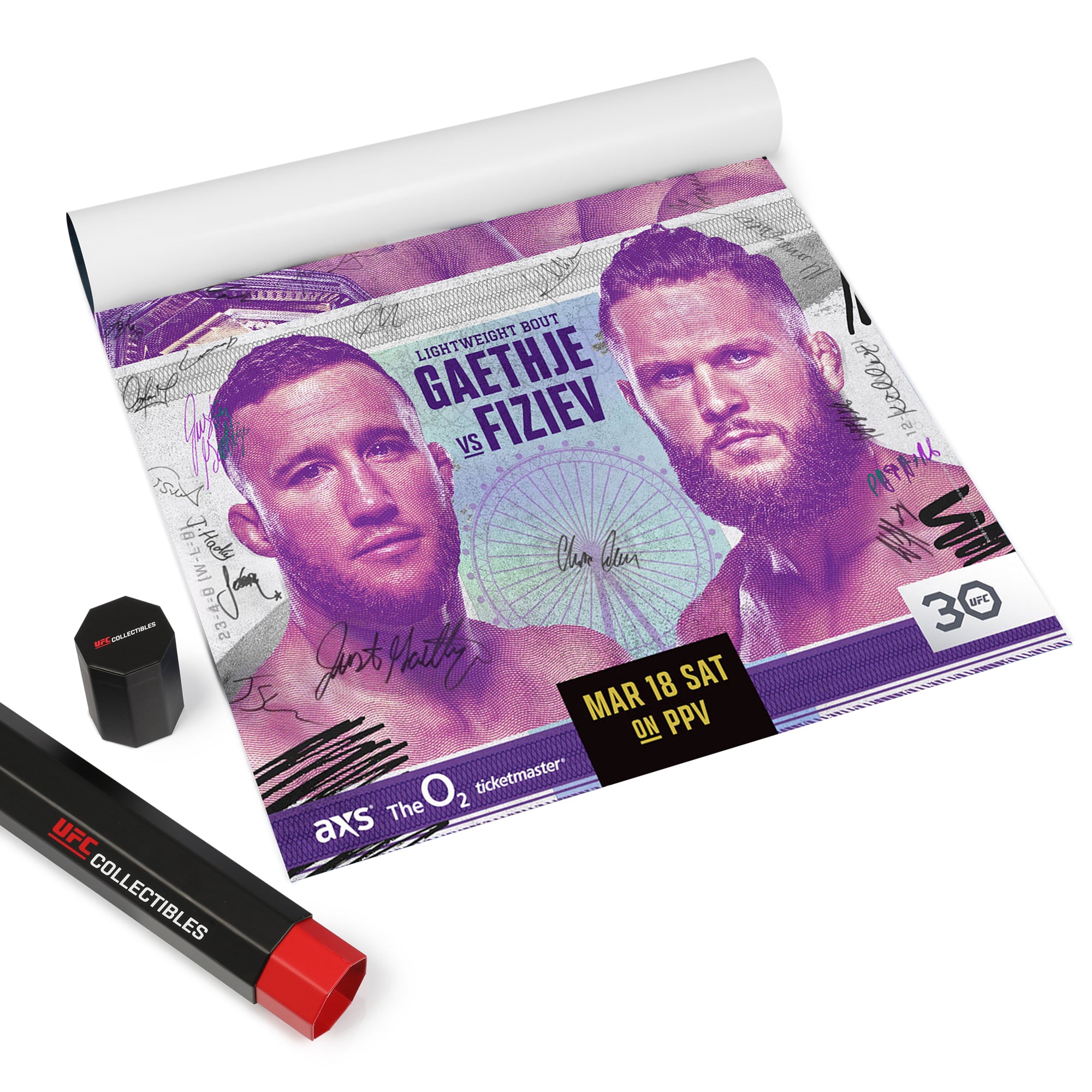 This poster has been signed by every athlete who competed on the main and preliminary card, featuring names such as, Justin Gaethje, Rafael Fiziev, and Lerone Murphy.