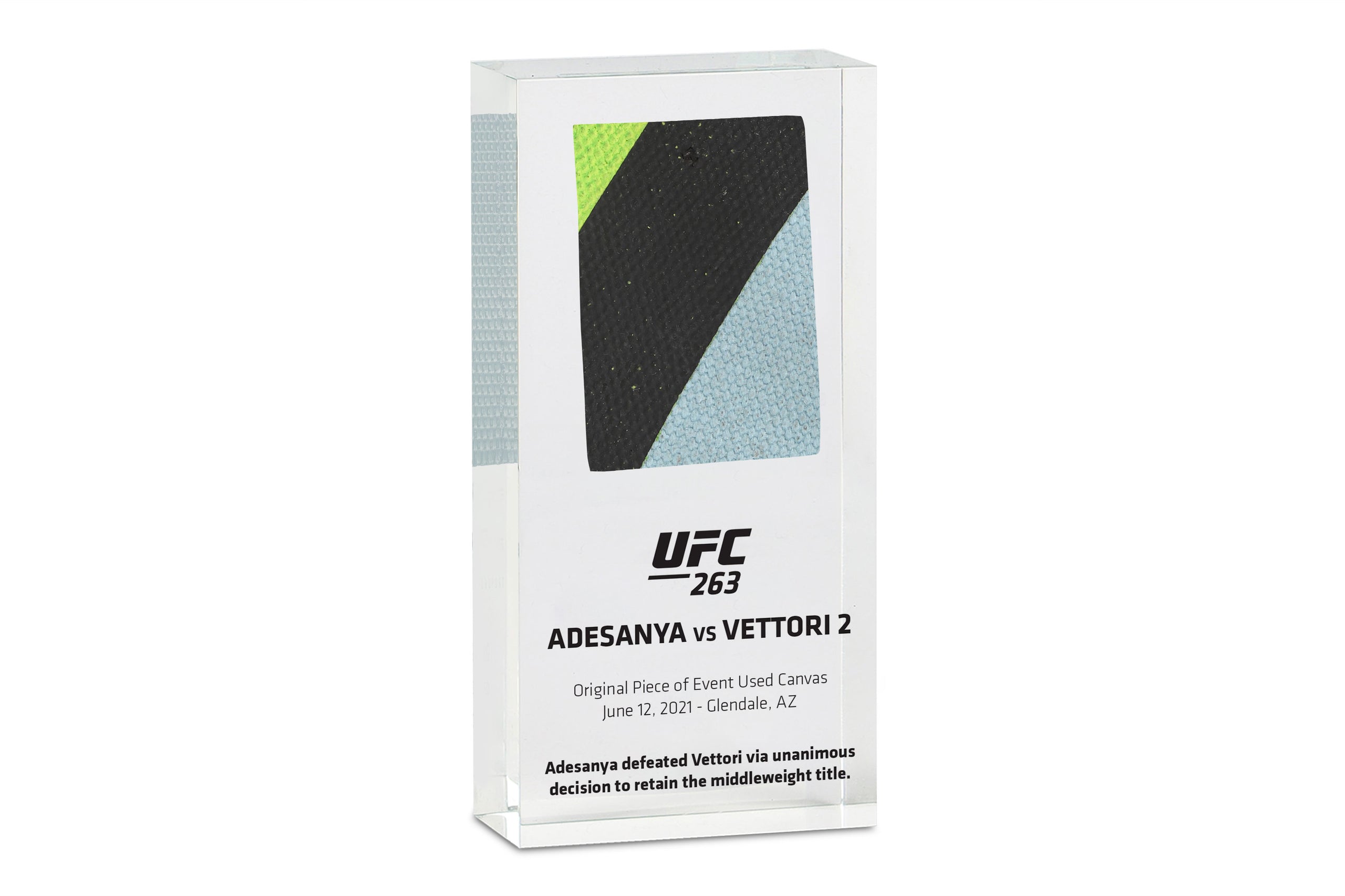 Own this official piece of UFC memorabilia; encapsulated within transparent acrylic, this hand-cut piece of canvas once lined the Octagon for the 2021 UFC 263: Adesanya vs Vettori event.
