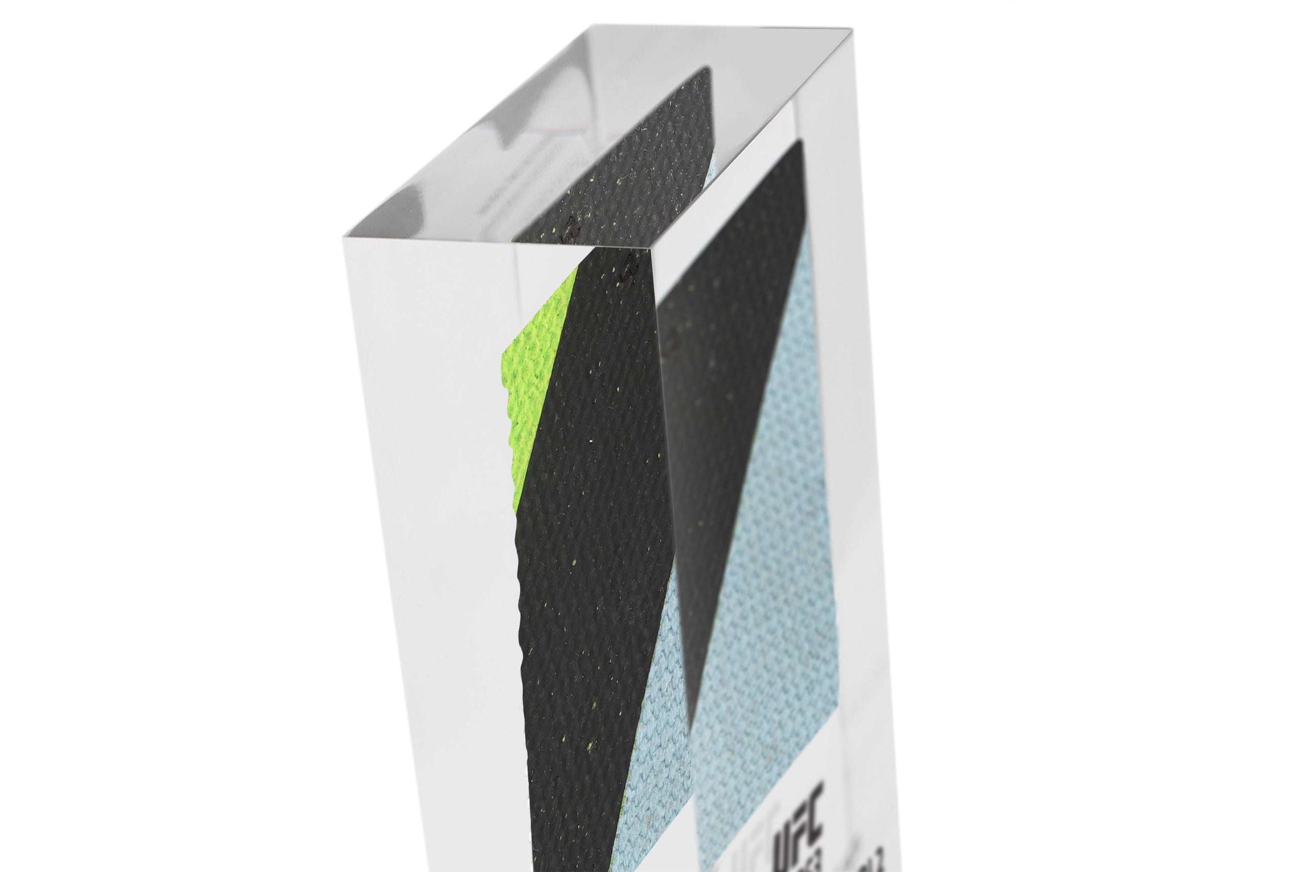 This section of canvas has been hand-cut from the full canvas that lined the famous Octagon for this incredible fight. Now, it floats within transparent acrylic – a moment captured in time.