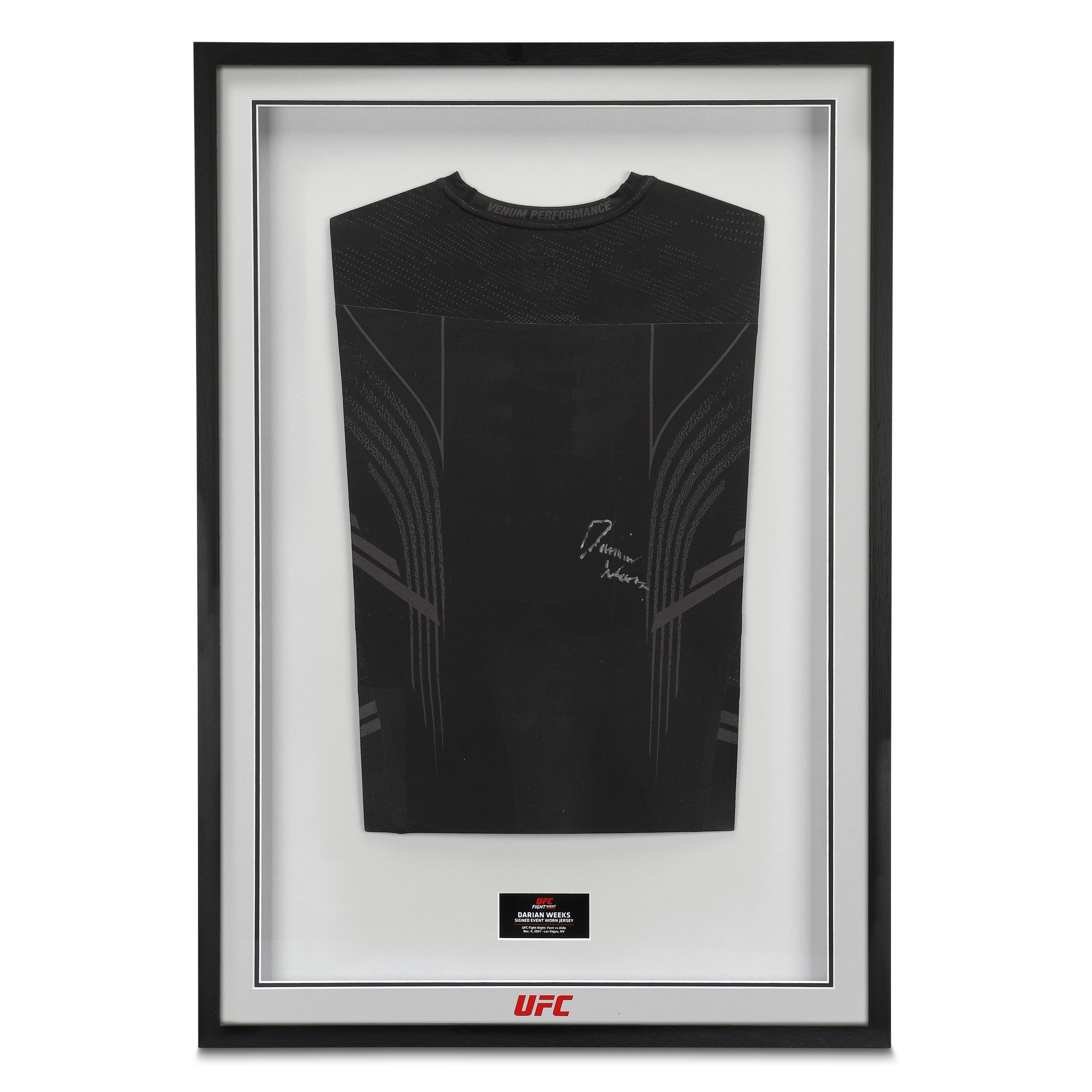 Own a piece of UFC and Darian Weeks history with the UFC Fight Night: Font vs Aldo signed fight issued Jersey and celebrate the fighter’s debut in the UFC. It comes professionally framed and ready to display.