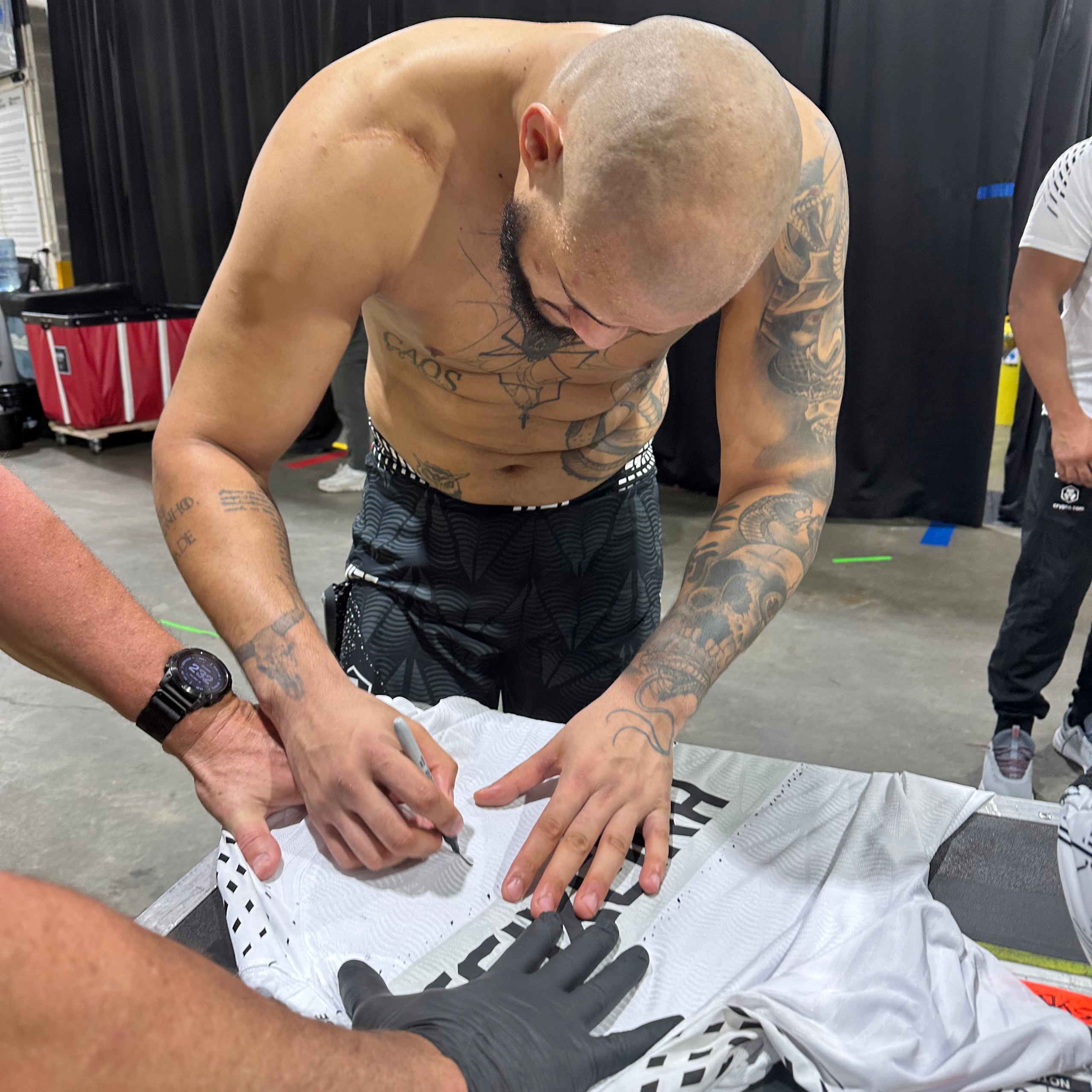 Please allow up to 6 weeks for delivery of event used and fight worn items. This is due to the items requiring sanitisation after events, and to allow for overseas shipping.