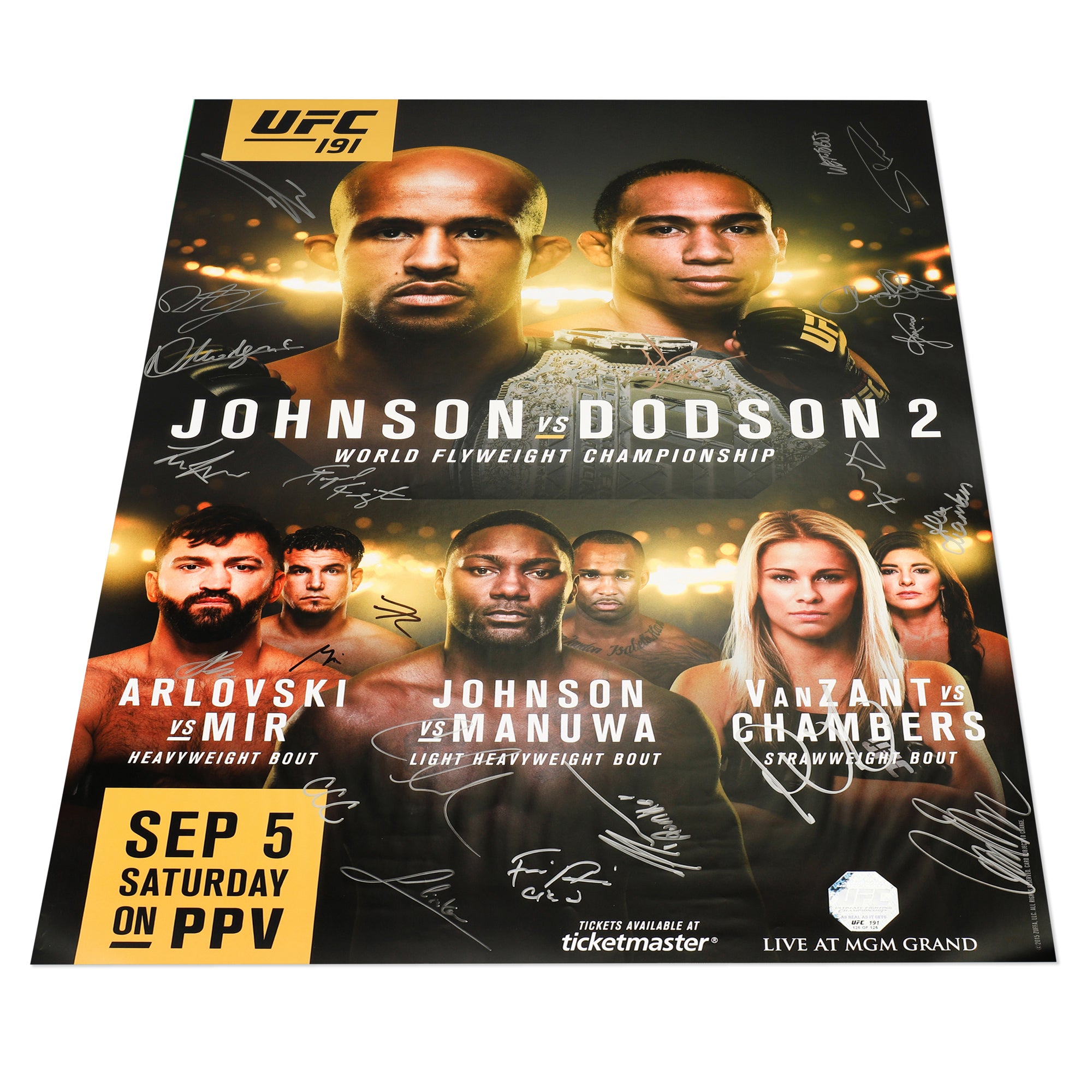 Now you can own a piece of the history forged during the UFC 191: Johnson vs Dodson 2 event with this autographed poster. However, this product has limited availability, so it is essential you act fast to secure this piece for your collection.