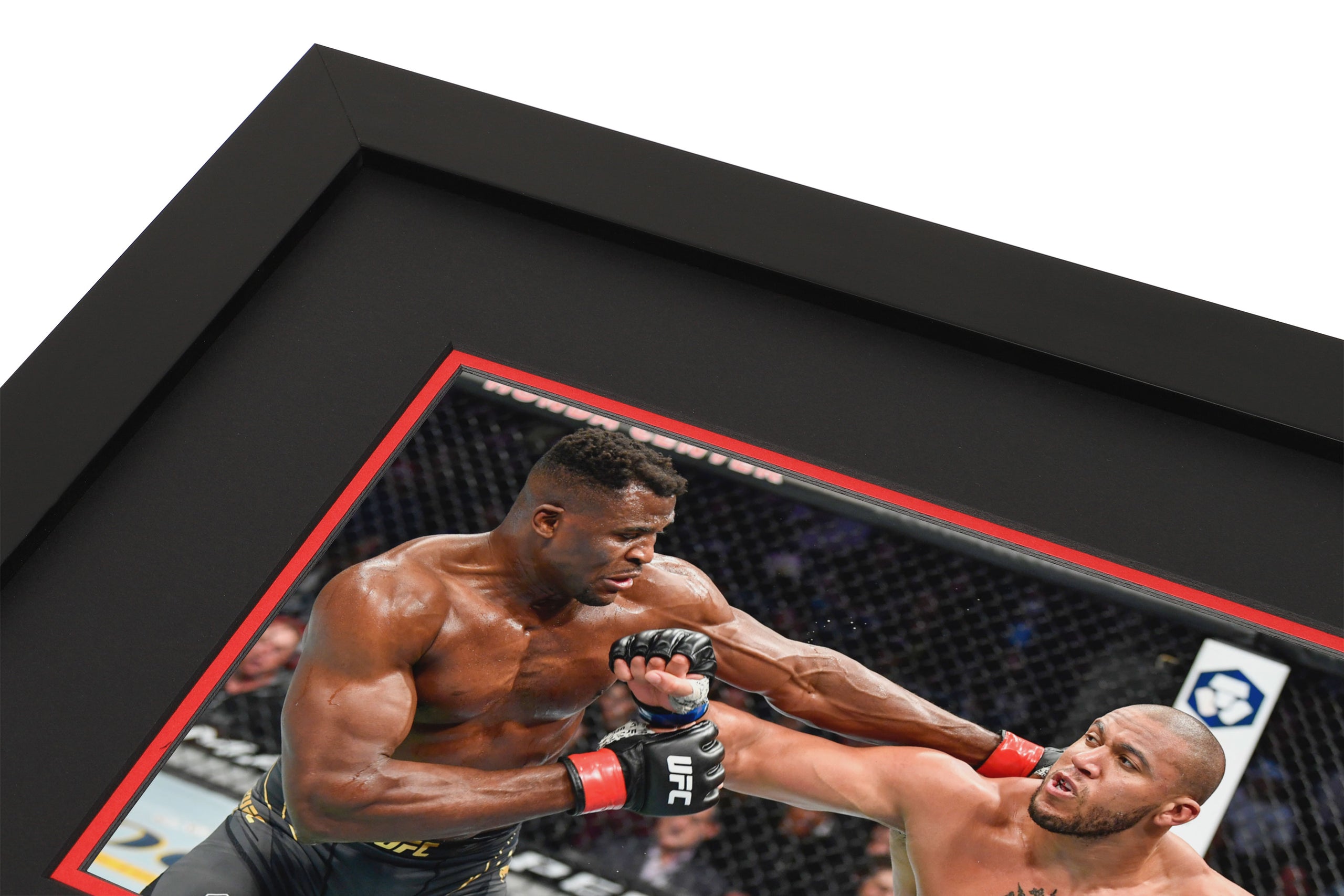 Own this official piece of UFC memorabilia; this framed photograph captures the 2022 Main Card bout between Francis Ngannou and Ciryl Gane and features a hand-cut piece of canvas, which lined the Octagon during the fight.