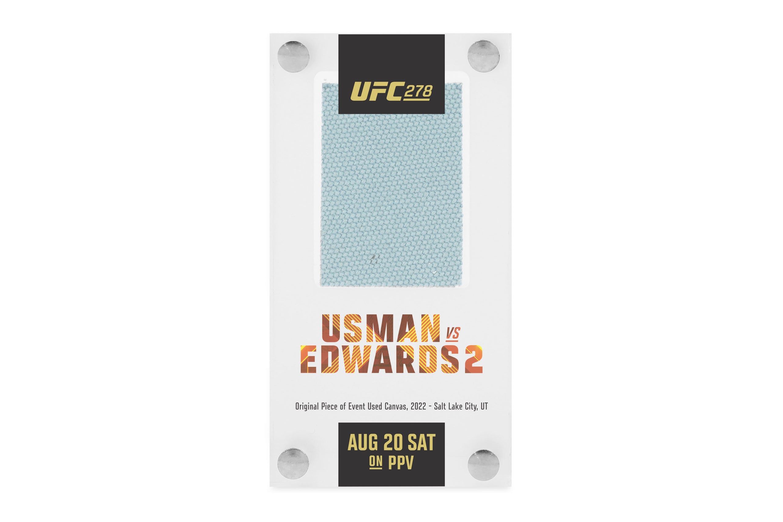 This is your chance to own a piece of UFC history with this canvas in acrylic from UFC 278: Usman vs Edwards 2. This product will include a piece of the very canvas fought on during the event. The event took place on Saturday August 20, 2022, at the Vivint Arena in Salt Lake City,...