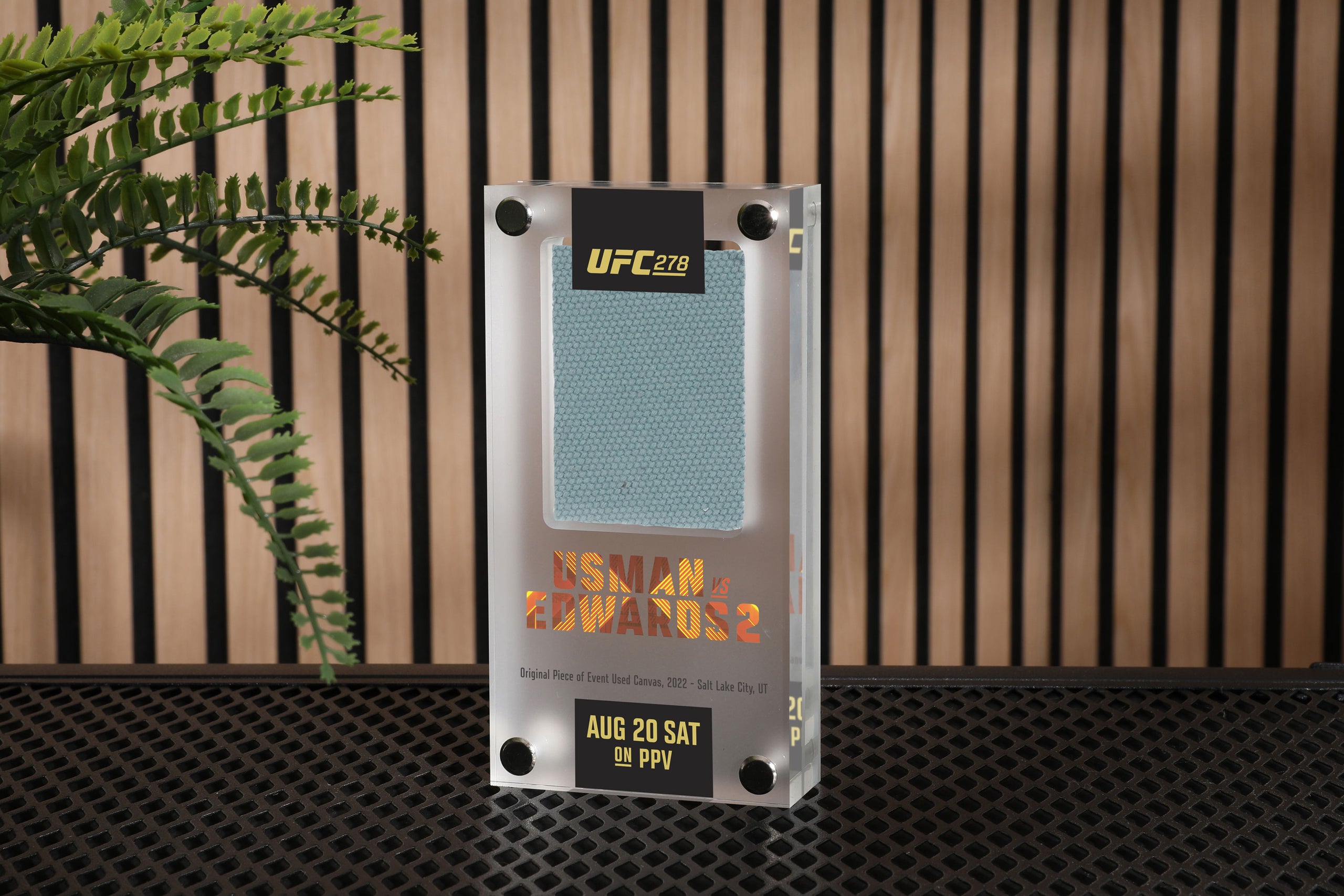 This is your chance to own a piece of UFC history with this canvas in acrylic from UFC 278: Usman vs Edwards 2. This product will include a piece of the very canvas fought on during the event.