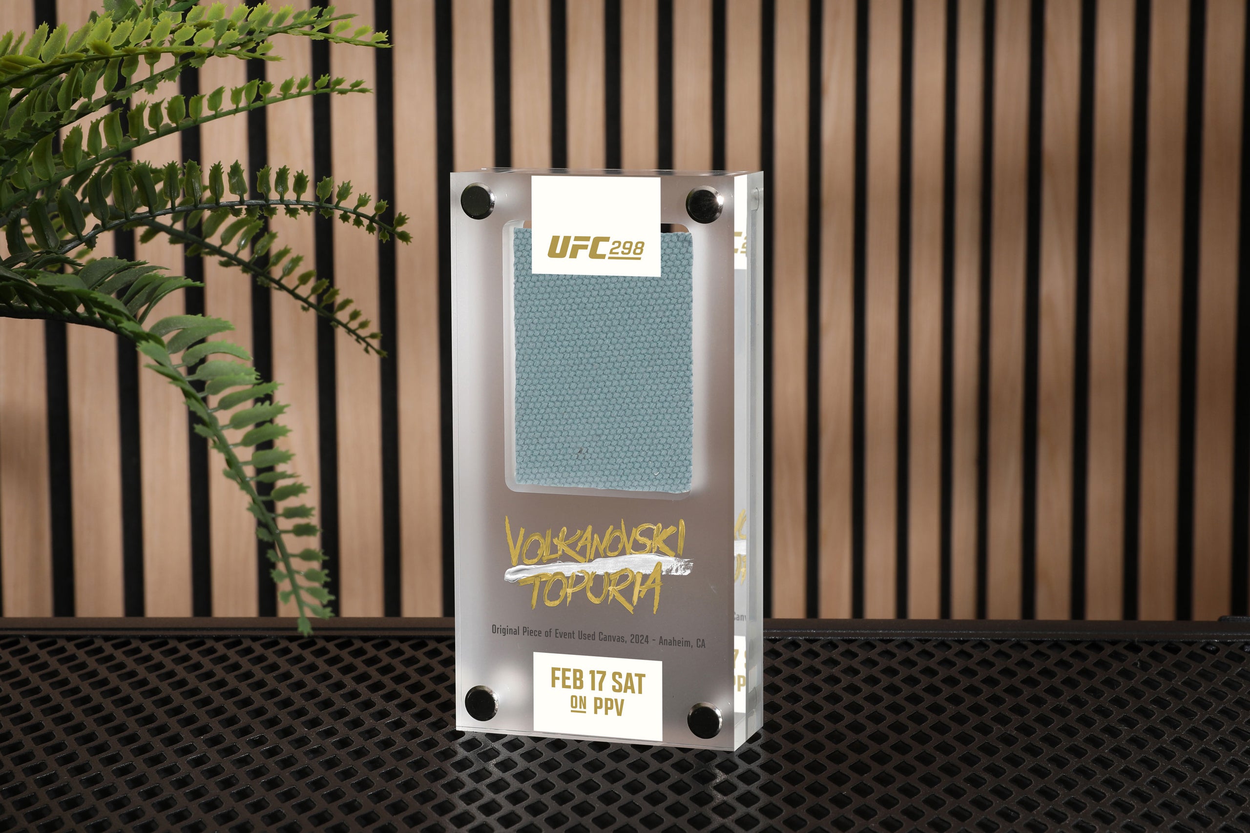 Take home a piece of UFC history with this canvas in acrylic from UFC 298 where Alexander Volkanovski took on Ilia Topuria in a featherweight championship showdown. This new canvas in acrylic piece gives you a closer feel to the Octagon than ever before, as you can now open the piece of acrylic in order to look more closely at the canvas.