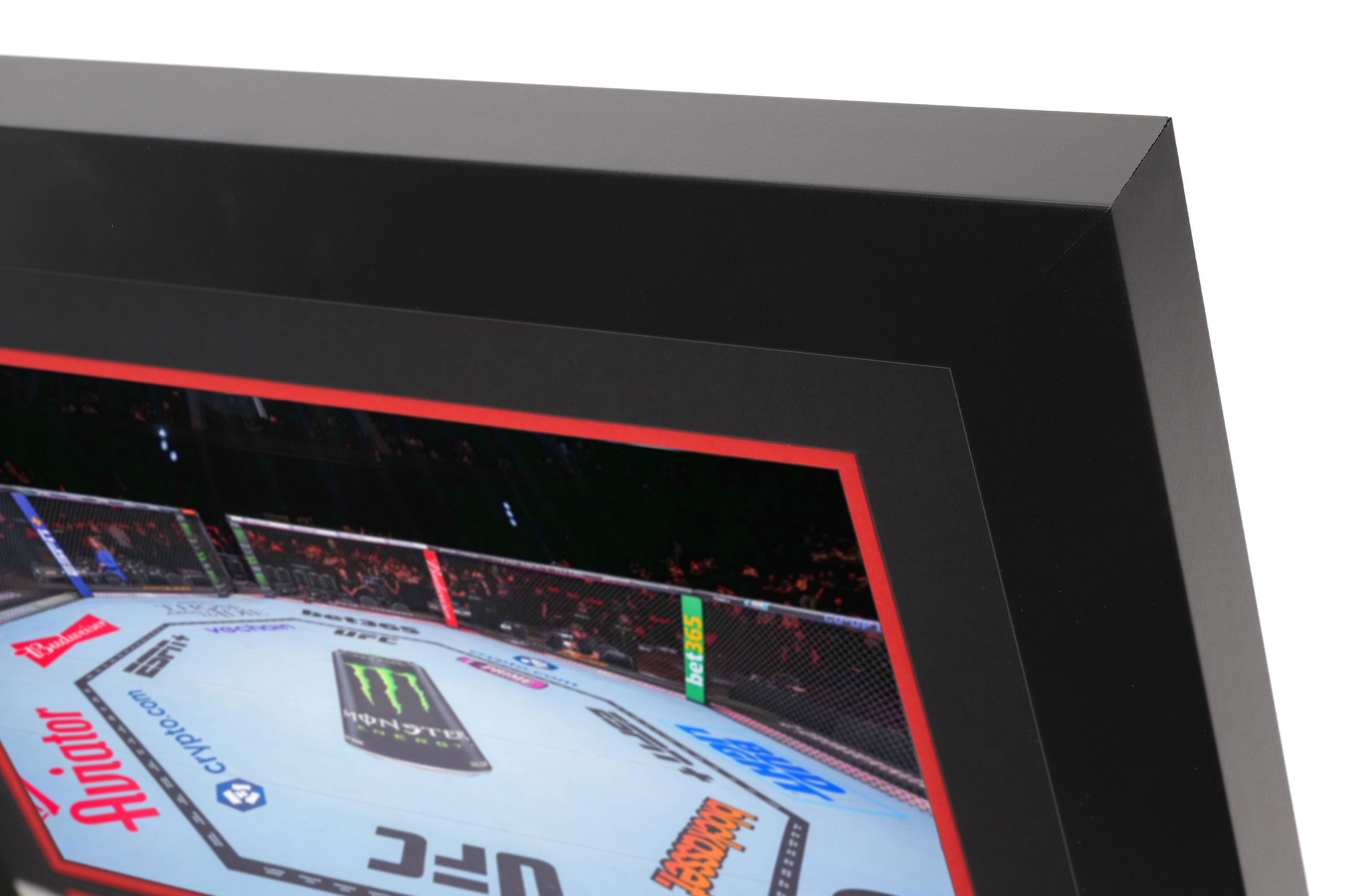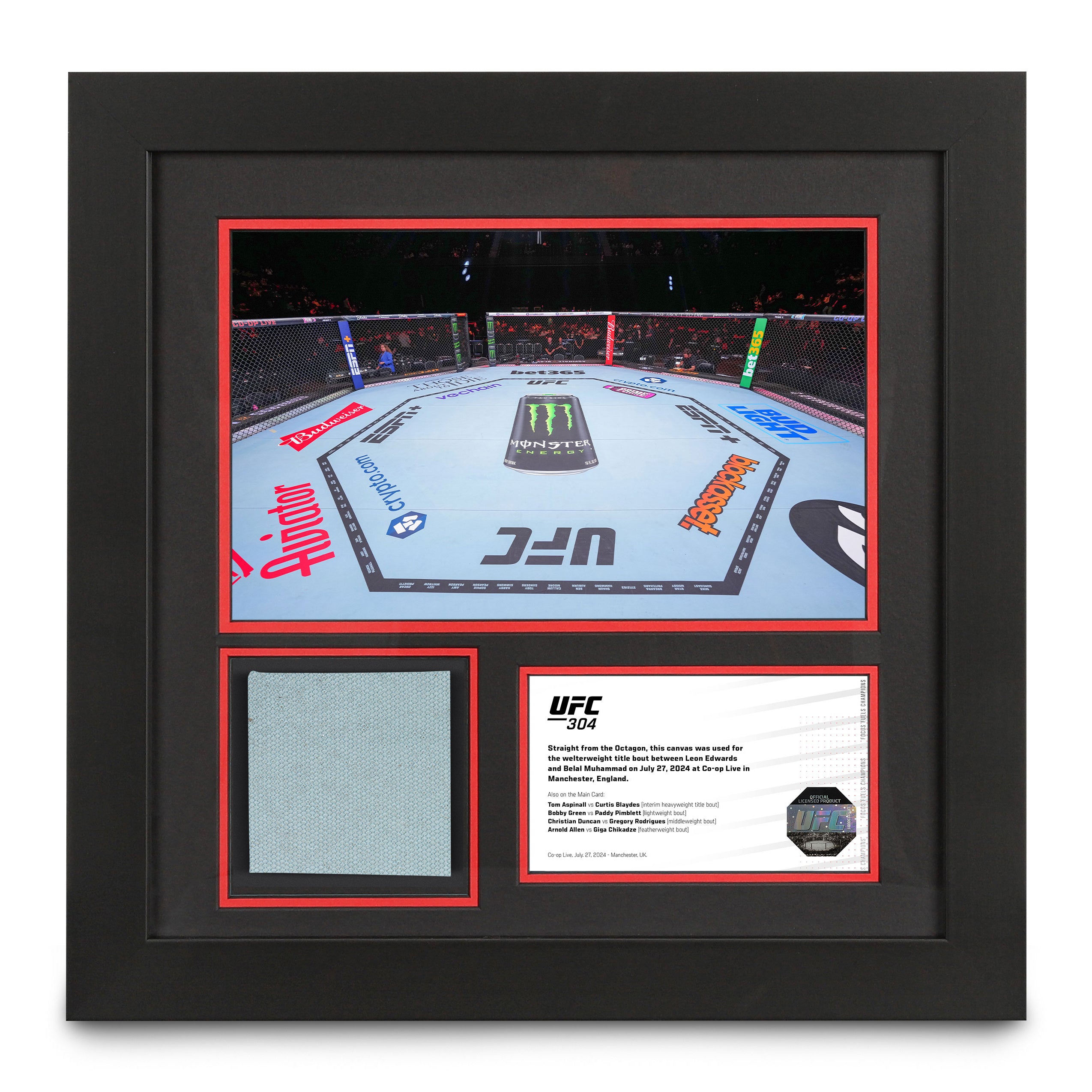 Own a piece of UFC history from the Octagon, with this photo display featuring a hand-cut piece of the canvas that was used at UFC 304.
