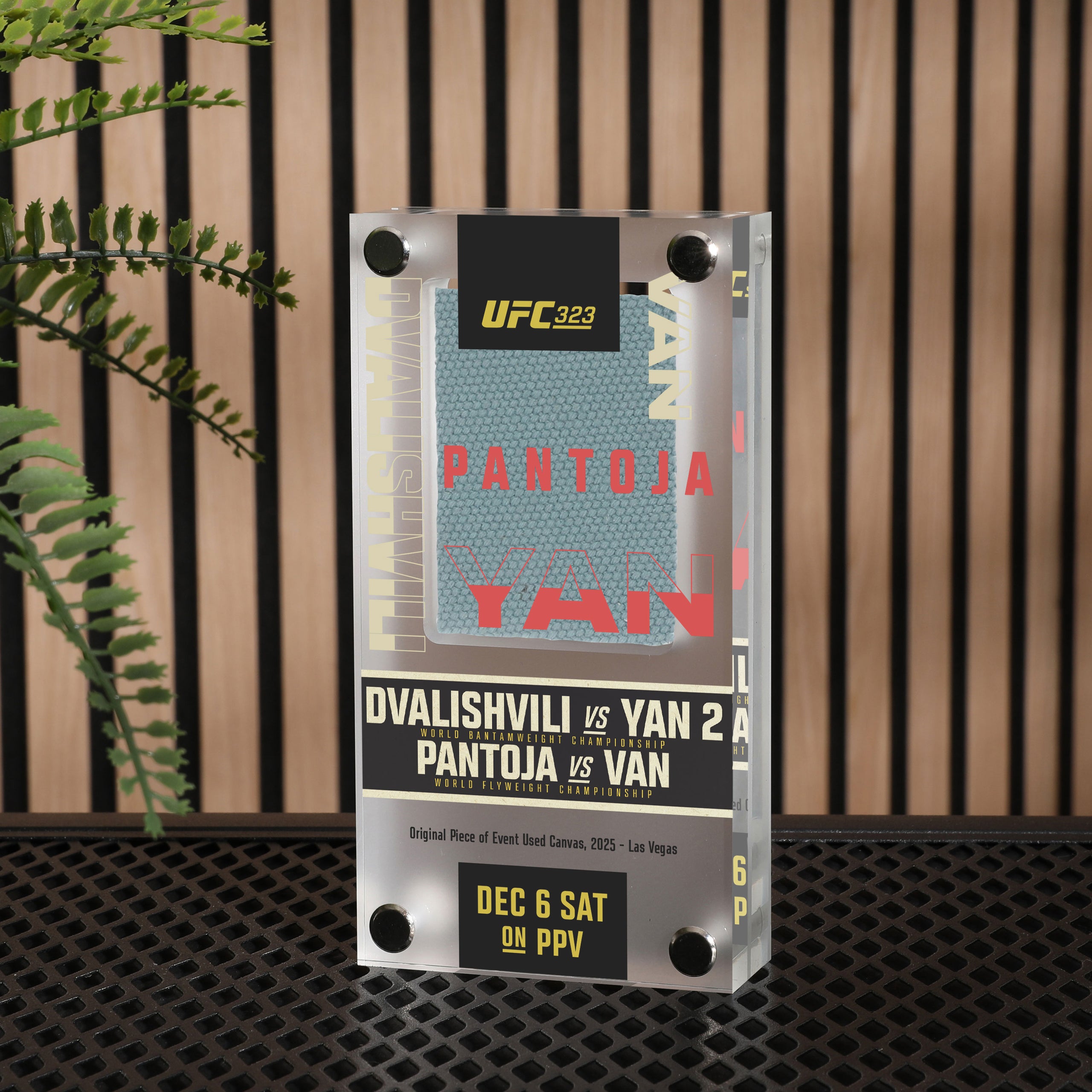 This is your chance to take home a genuine piece of UFC history with this canvas in acrylic from the UFC 323: Dvalishvili vs Yan 2 event. This product will include a piece of the very canvas fought in during the event, perfectly displayed in an acrylic case.