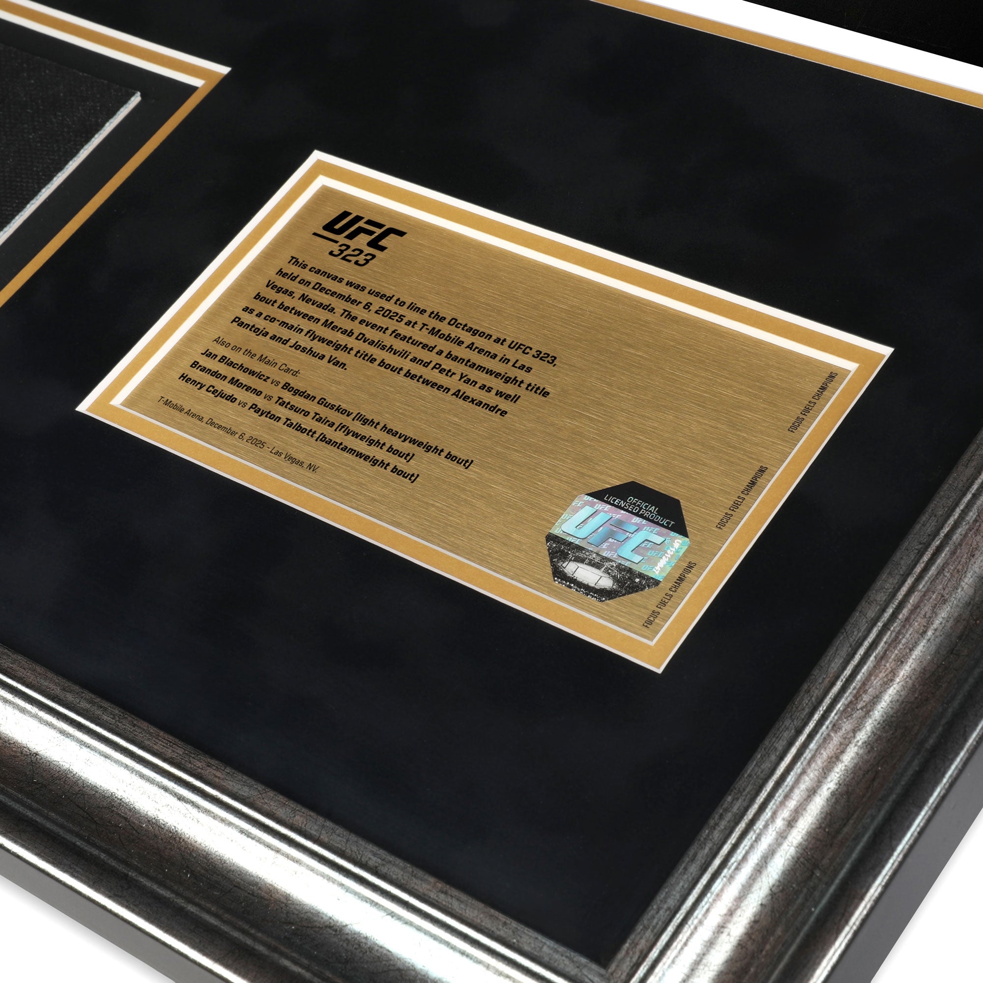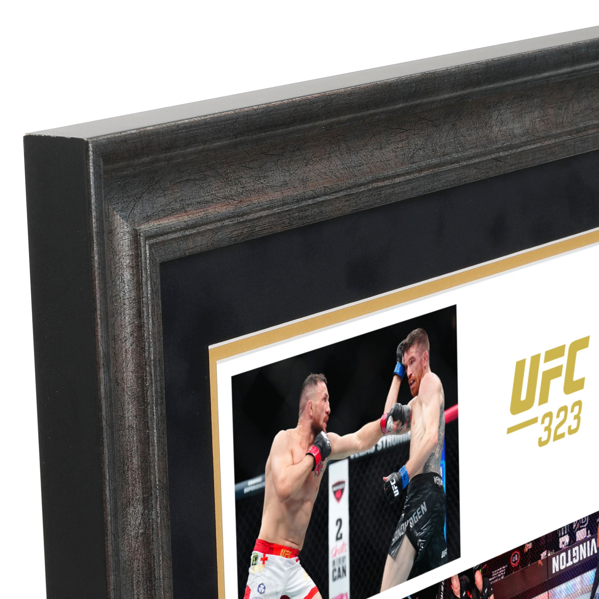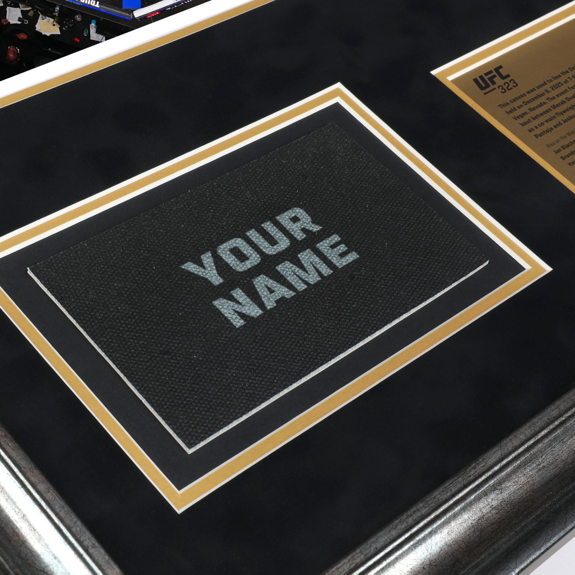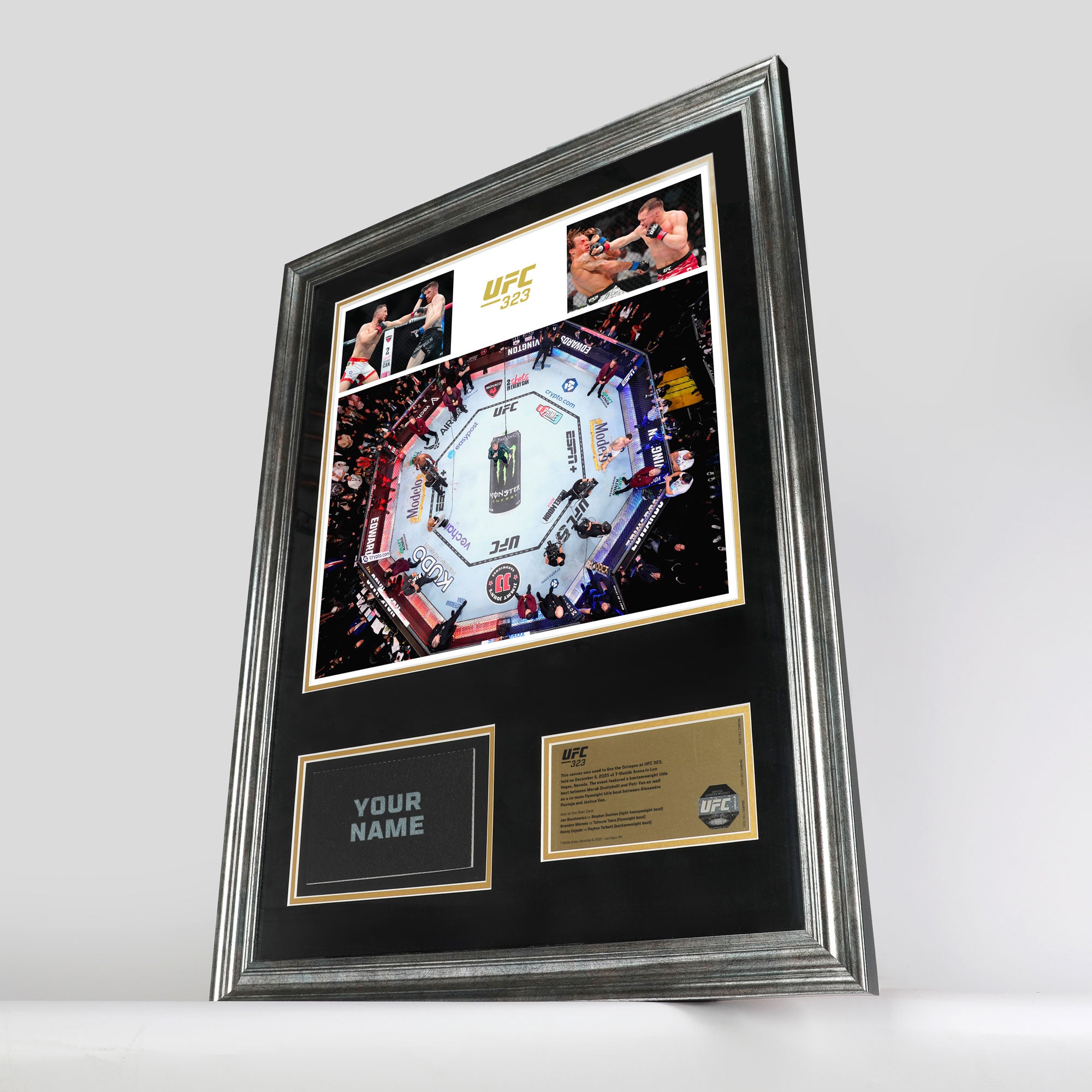 • After the event, the canvas will be sterilised and returned to UFC Collectibles where it will be hand cut, placed alongside a photograph from the event and professionally framed
