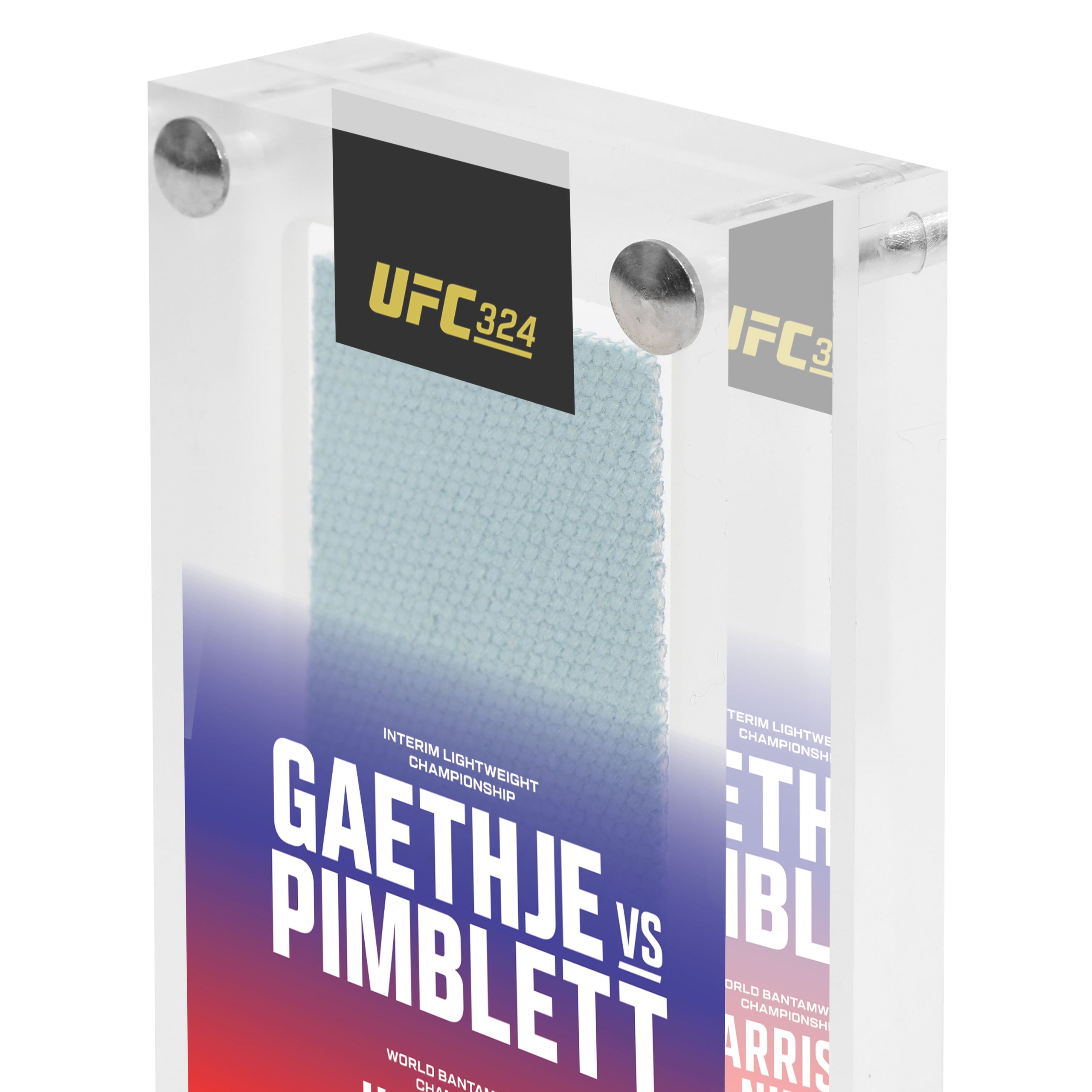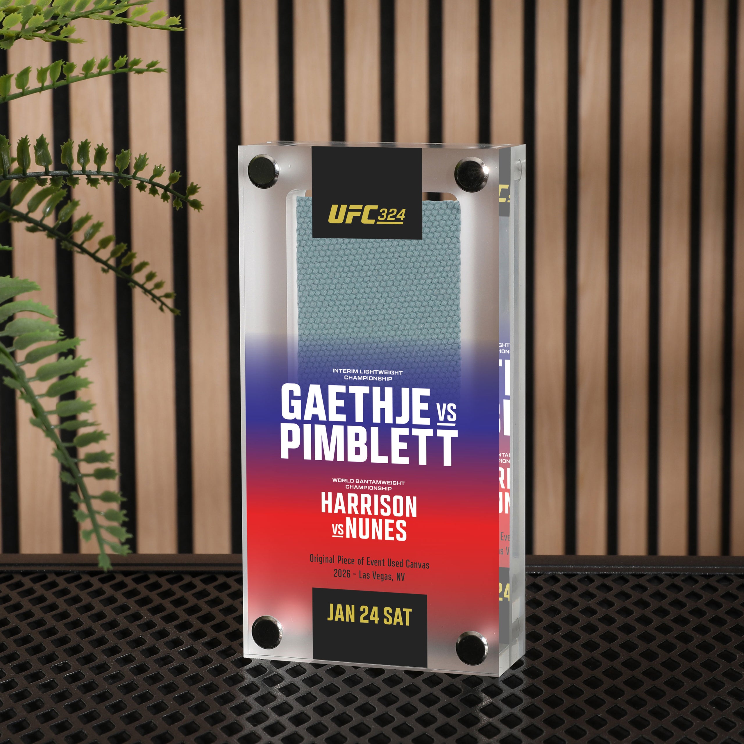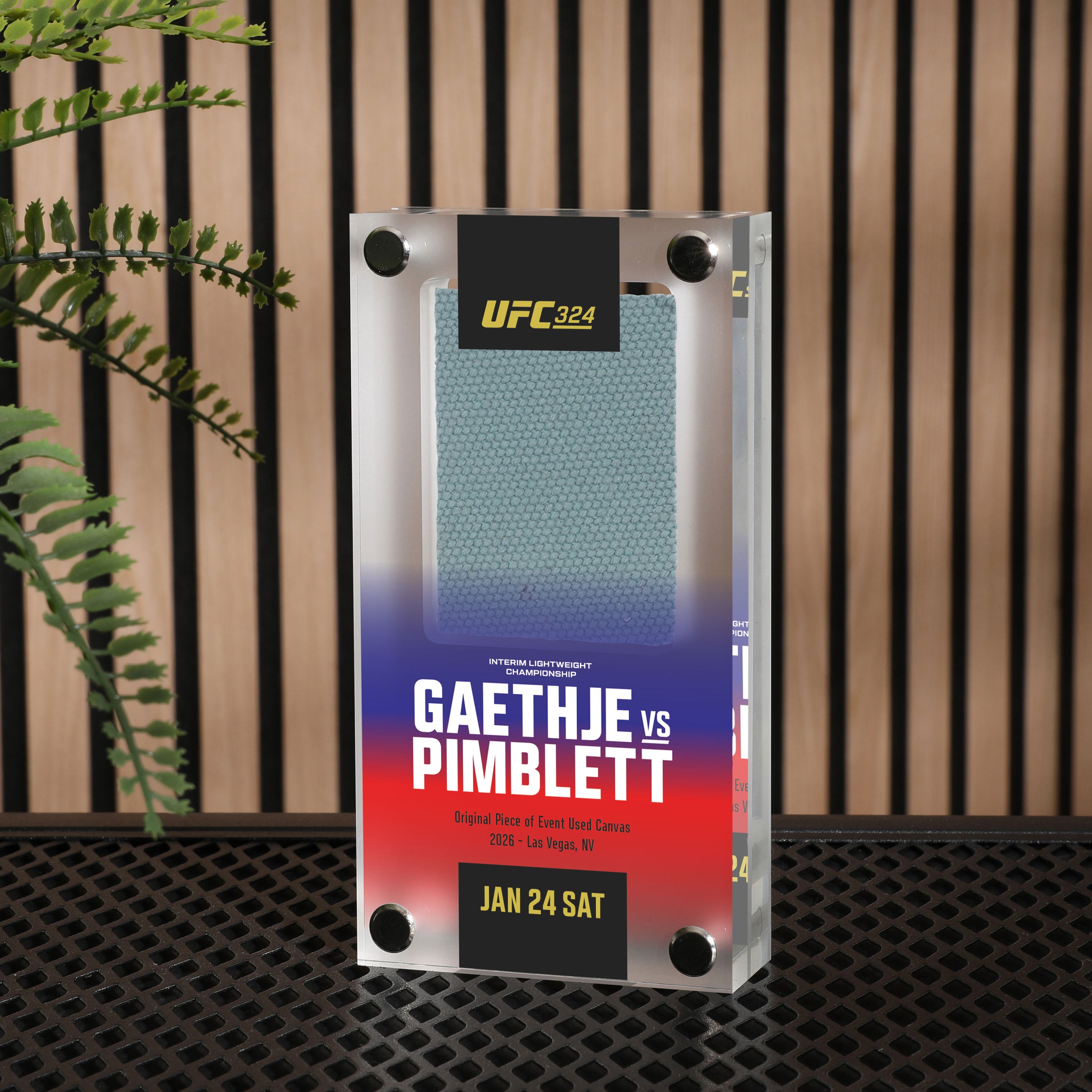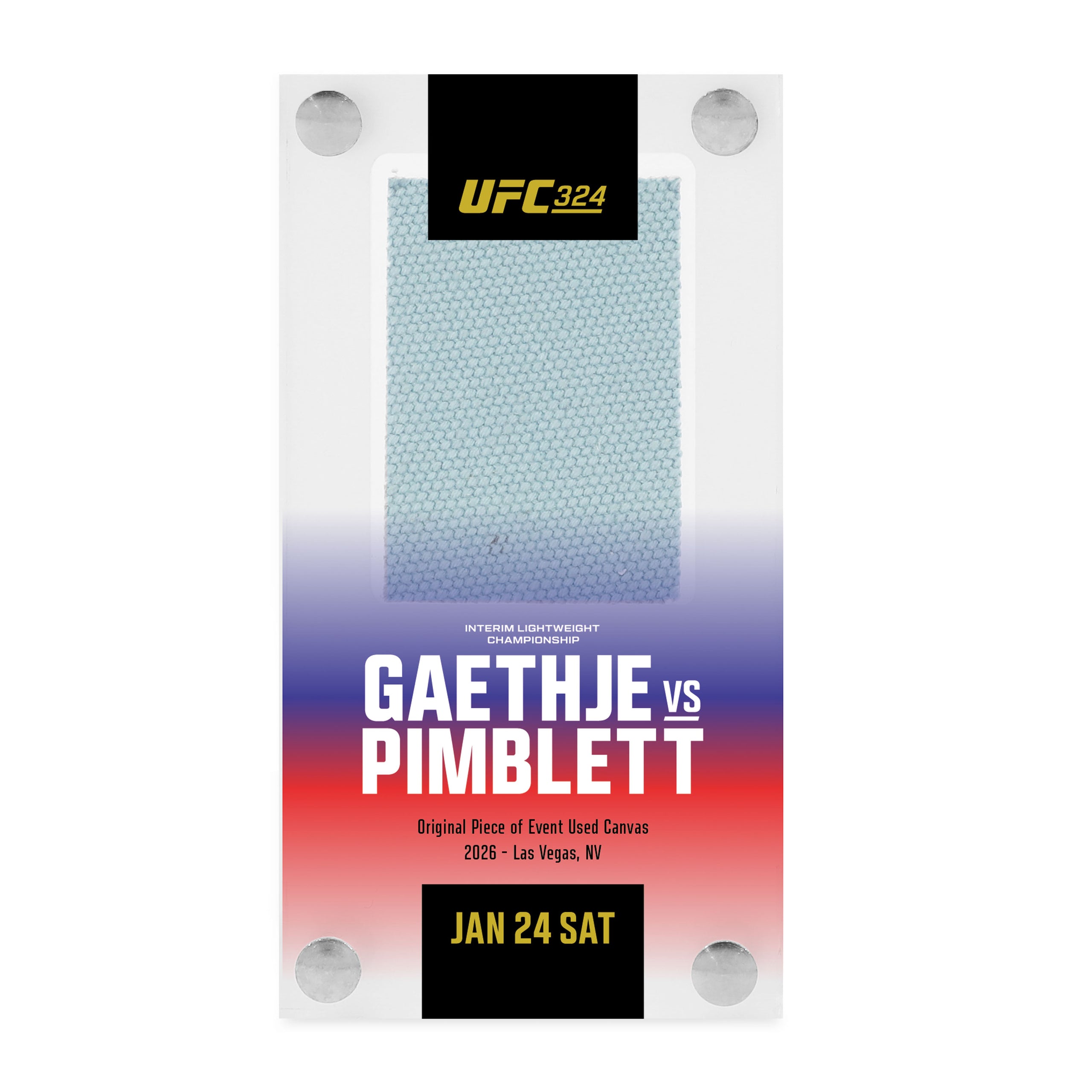This is your chance to take home a genuine piece of UFC history with this canvas in acrylic from the UFC 324: Gaethje vs Pimblett event. This product will include a piece of the very canvas fought in during the event, perfectly displayed in an acrylic case.