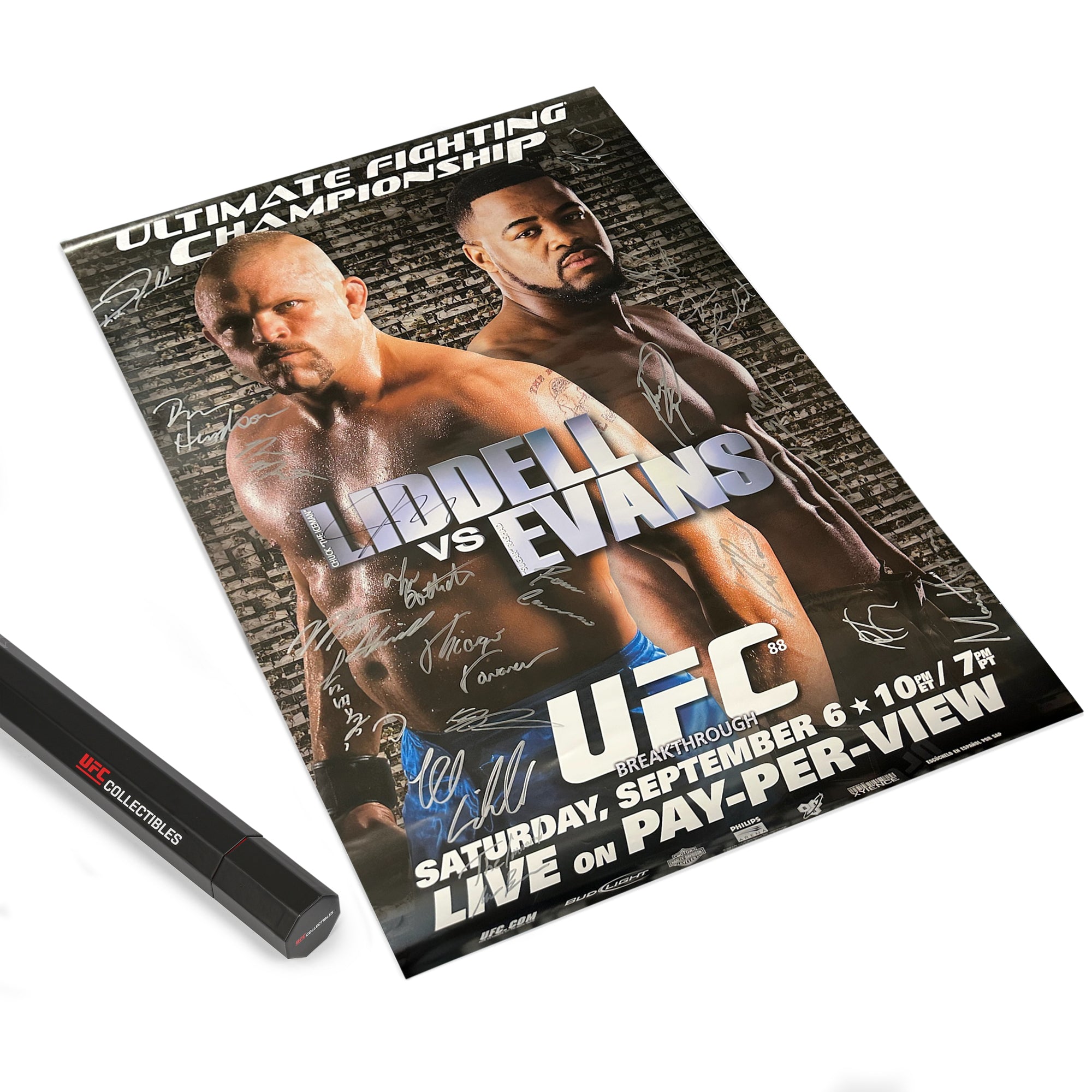 This is your chance to take home a genuine piece of UFC history with this autographed poster from the UFC 88: Liddell vs Evans event. This poster has been signed by every athlete who competed on the card and could be the perfect addition to your collection.